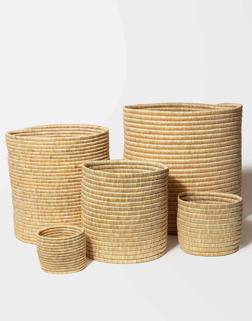 To produce these baskets, artisans masterfully use sustainable materials including locally harvested grasses and recycled grain sacks along with small weaving tools. They carefully plan the design of each piece and subsequently align rows of grass to reveal a unique shape and design. It takes anywhere from two to seven days to complete each piece; the length of production is dependent on the size and unique design of each piece.